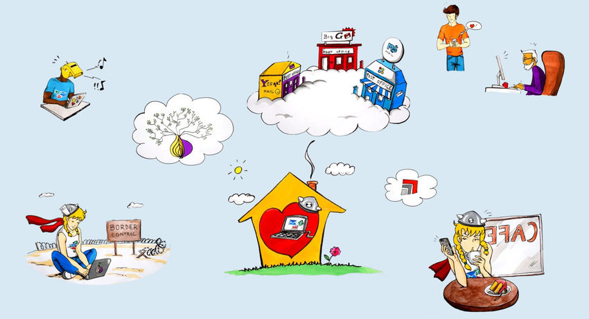 The PyCon UK poster session was a perfect opportunity to finally do something about this; I commissioned drawings which can be used to illustrate some of the expected use-cases of Mailpile, where data resides and what paths the information follows.